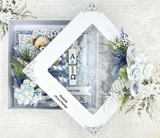 Pamiątka Chrztu Świętego dla chłopca - Okolicznościowa Kartka 3D - o wymiarach 15 x 15 cm w pudełku z transparentnym ...